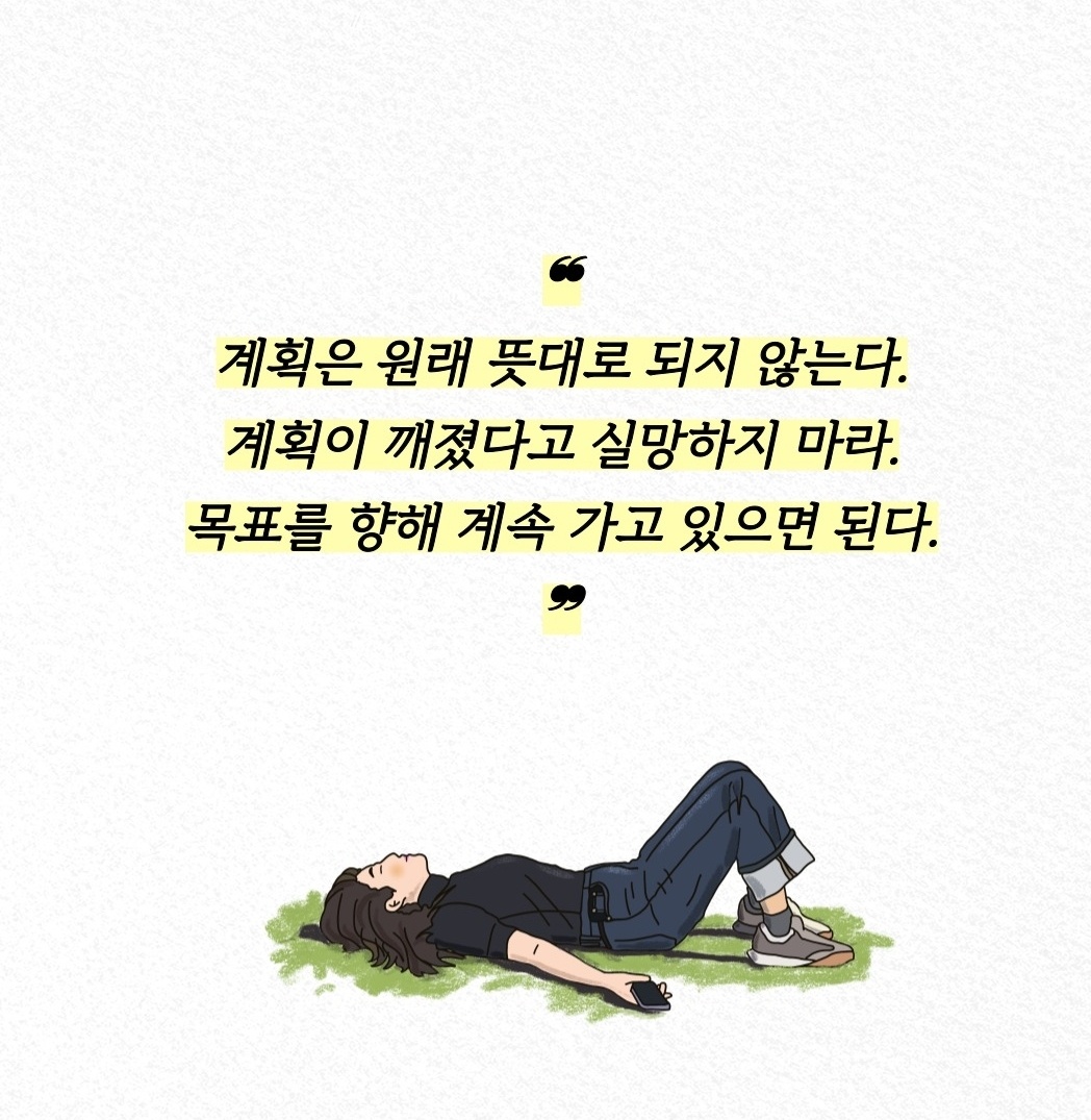 아무리 철저한 계획을 세우더라도, 현실은 종종 우리의 예상을 벗어납니다. 계획이 무너졌다고 해서 좌절할 필요는 없습니다. 중요한 것은 목표를 향해 끊임없이 나아가는 것입니다. 계획은 그저 방향을 제시할 뿐, 길을 완전히 결정짓지는 않습니다. 계획이 틀어지면 새로운 길을 찾으면 됩니다. 목표를 포기하지 않는 한, 우리는 언제든지 원하는 곳에 도달할 수 있습니다.