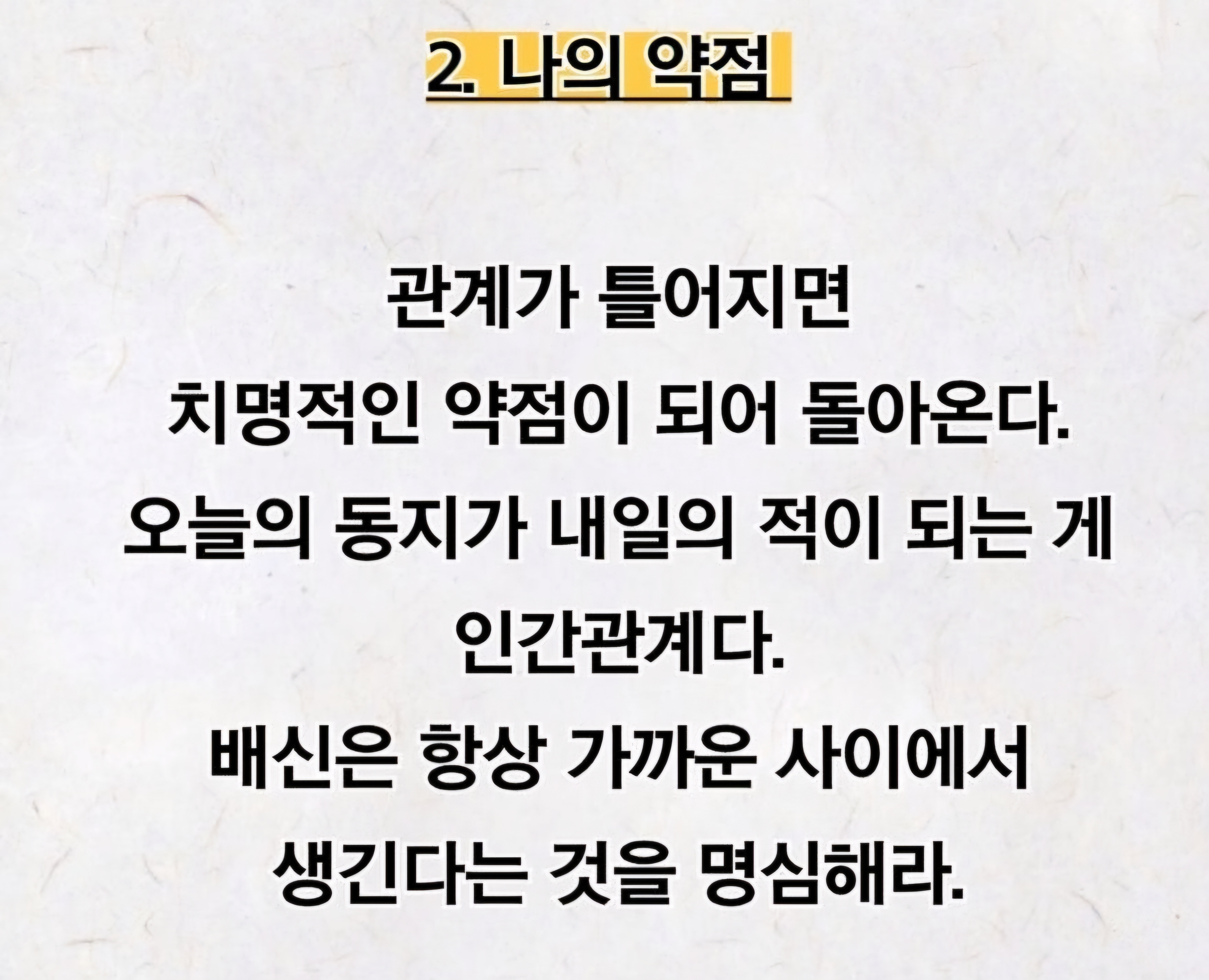 "나 사실 이런 약점이 있어..." 친한 친구에게 고백하고 싶은 순간이 있죠. 하지만 조심하세요! 오늘의 친구가 내일의 적이 될 수 있습니다. 슬픈 현실이지만, 인간관계는 변할 수 있어요. 여러분의 약점은 언제든 치명적인 무기가 될 수 있습니다. 배신은 항상 가까운 사이에서 일어난다는 것, 잊지 마세요.